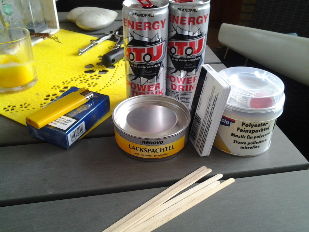 Energy Drink, Spachtelmasse, alte scheckkartenähnliche Spachtel Werkzeuge :D und die obligatorischen MCD Kaffeeumrühr Stäbchen zum anmischen!