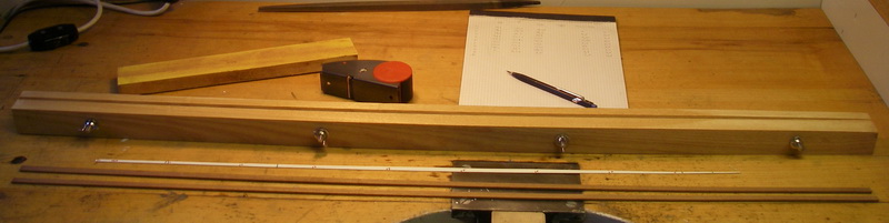 Auf dem Bild sieht man die weisse Plankenschablone, die rohen Mahagoniplanken, die Spannvorrichtung, den Hobel und Schleifklotz.