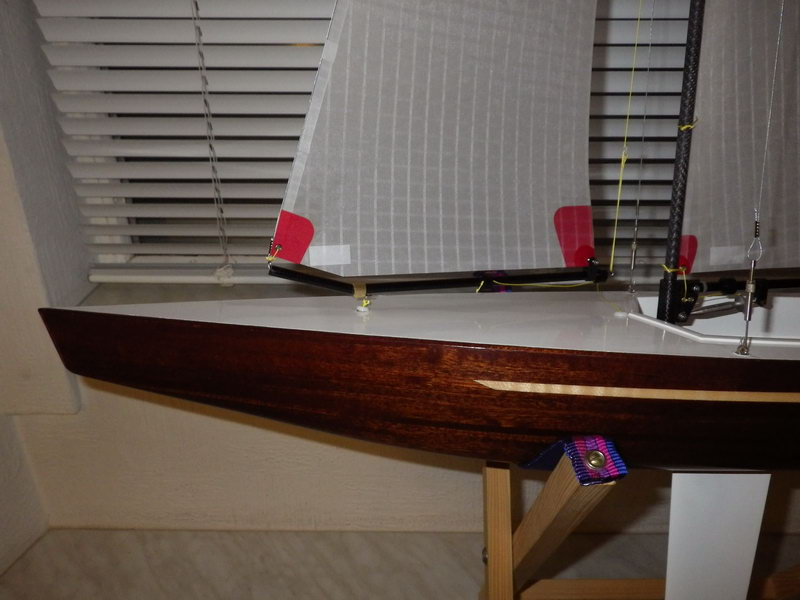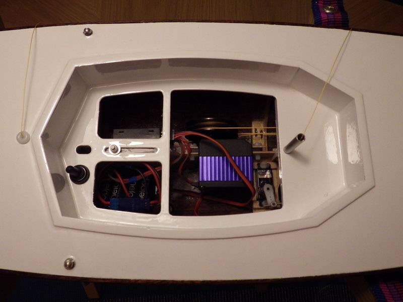 Das Boot ist nun fertig, RC-Einbau komplett mit Schalter. Die Oeffnungen möchte ich mit weisser Folie abkleben, da das Cockpit dicht sein muss. Allenfalls eintretendes Wasser sollte über die Kieltasche abfliessen können. Mit der Seilwinde bin ich bis jetzt zufrieden, ich denke die Geschwindigkeit ist auch ok. Jetzt fehlt noch das Rigg, ich möchte auch aus optischen Gründen ein Rigg mit Saling und Wanten bauen.