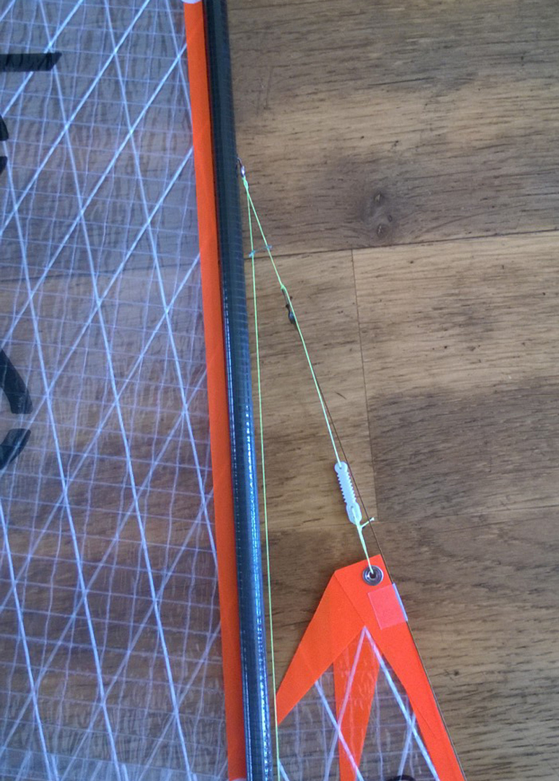 Die Latten bestehen aus dicker Mylarfolie (max. 350 Micron, CFK sieht schick aus bringt aber bei der Größe der Segel nichts). Sie werden mit doppelseitigen Klebeband aufgeklebt und hinten mit einem großen, runden Patch (16mm Durchmesser) und vorne mit einem kleinen, runden Patch (8mm Durchmesser) gesichert. Zwingend erforderlich sind die Verstärkungen nicht aber sie geben Vertrauen und sehen schick aus. Den vorderen Patch nicht zu groß machen. Durch die Aufdopplung wird das Segel in dem Bereich steifer, das ist aber nicht erwünscht.