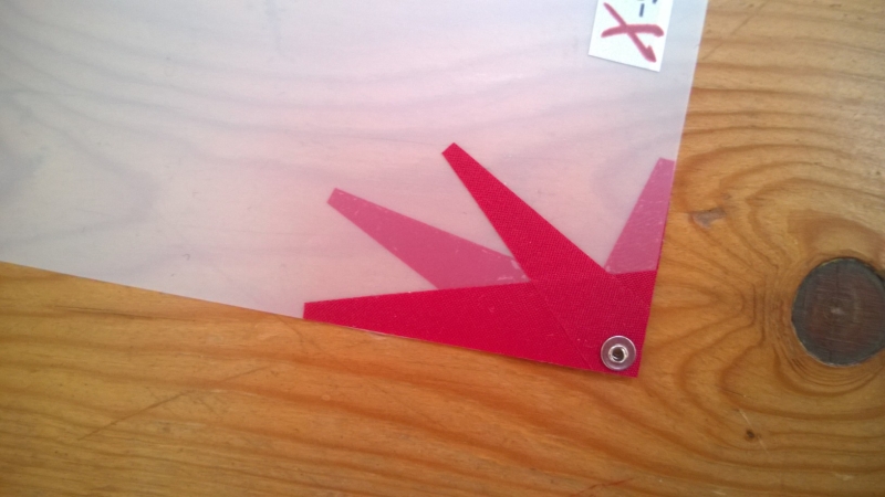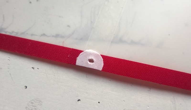 Das Vorliek des Großsegels bekommt noch runde Verstärkungen mit 8mm Durchmesser durch die, mithilfe eines spitzen Gegenstandes, Löcher gemacht werden um dort mit einer dünnen Schnur das Segel am Mast anzuschlagen. Ein durchbrennen mit einem Lötkolben ist nicht erforderlich, das hält auch so.
