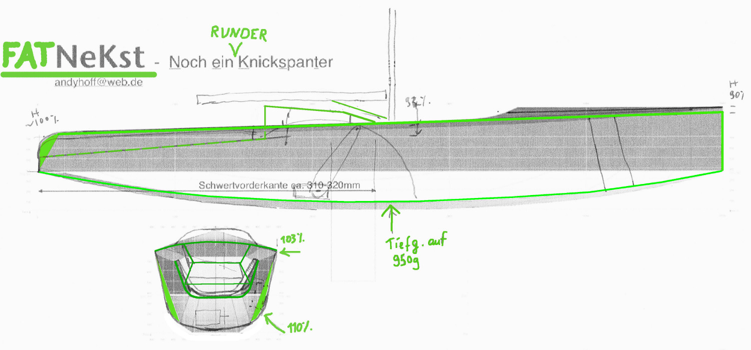 Um ein halbwegs konkurrenzfähiges Boot zu erhalten, habe ich die Abweichungen von Andys Original-Riss auf max. 10% begrenzt, wie diese Skizze zeigt: