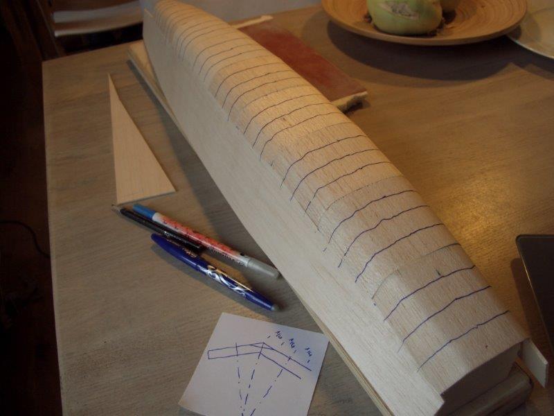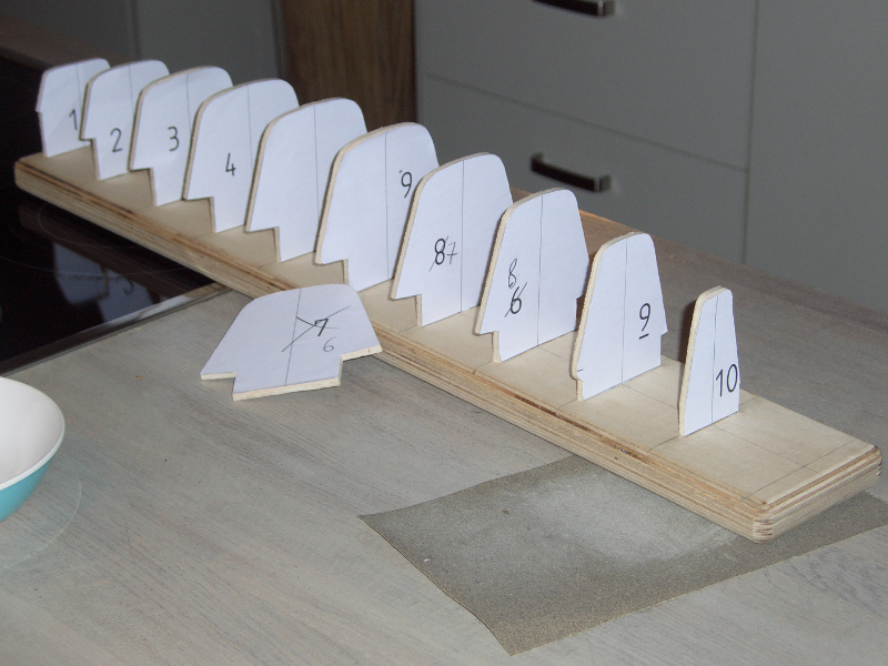 Und damit mir niemand mehr ausreden kann, schon wieder ein Boot breiter als vernünftig zu bauen, wurden die Spanten heute gesägt und aufgestellt.