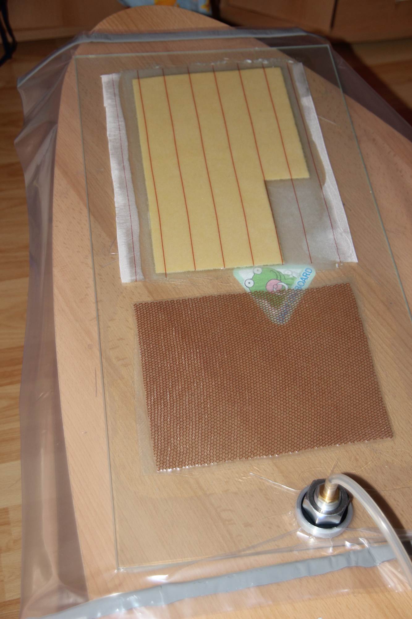 Harz wird beim Vakuumlaminieren übrigens nicht "abgesaugt". Abgesaugt wird nur die Luft und der umgebende Luftdruck presst das Laminat zusammen. Damit kann ein höherer Fasergehalt des Laminats erreicht werden (und überschüssiges Harz würde in die Hohlräume der Wabe gehen).