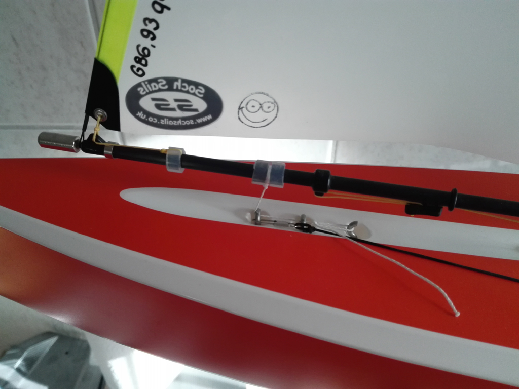 Schnur durch die Ösen fädeln. Gewünschte Fockbaumhöhe einstellen. Mit einem Edding den Berührungspunkt am Haken markieren.