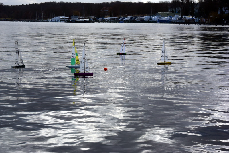 12 Boote hatten gemeldet, 13 kamen! Damit hatten wir wieder ein schönes Feld. Bei den herrschenden Windbedingungen hatten alle ihre Höhen und Tiefen und es war lange schwer abzuschätzen wer die Nase vorn haben würde. Im Endeffekt legten bei den 12 gesegelten Läufen Michael, Frank und Helmut die größte Konstanz an den Tag und belegten in dieser Reihenfolge die ersten drei Plätze. Michael fuhr mit der GRG 4 eine Eigenkonstruktion, Frank fuhr eine Mali und Helmut eine Sacrum.