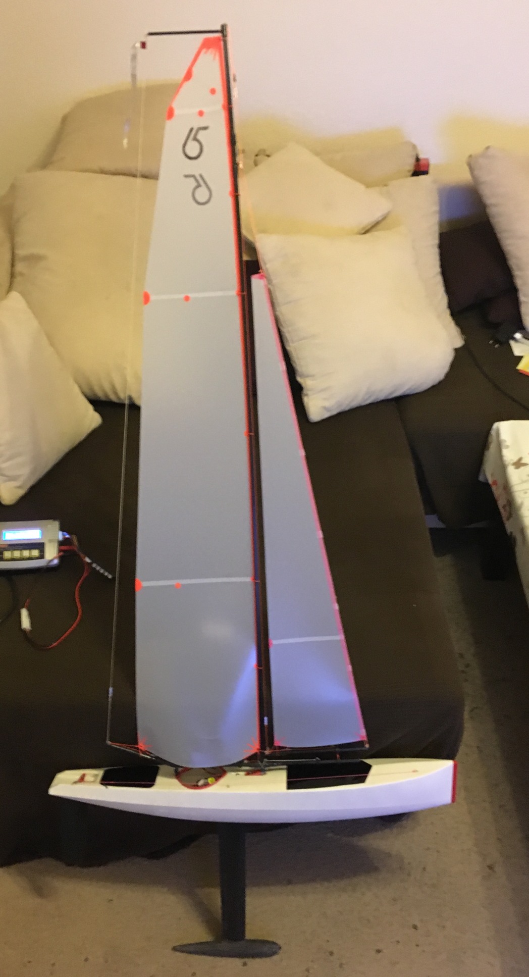 Lag aber nicht am Rumpf, oder den Anhängen! Ich habe das Groß einfach nicht in Form bekommen, aber das war vorher schon klar. Das komplette Rigg ist nur Erwins Bauvorlage und eigentlich nicht segelfähig.