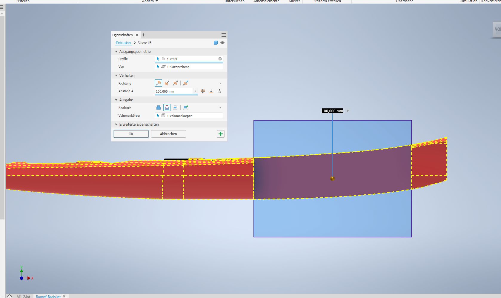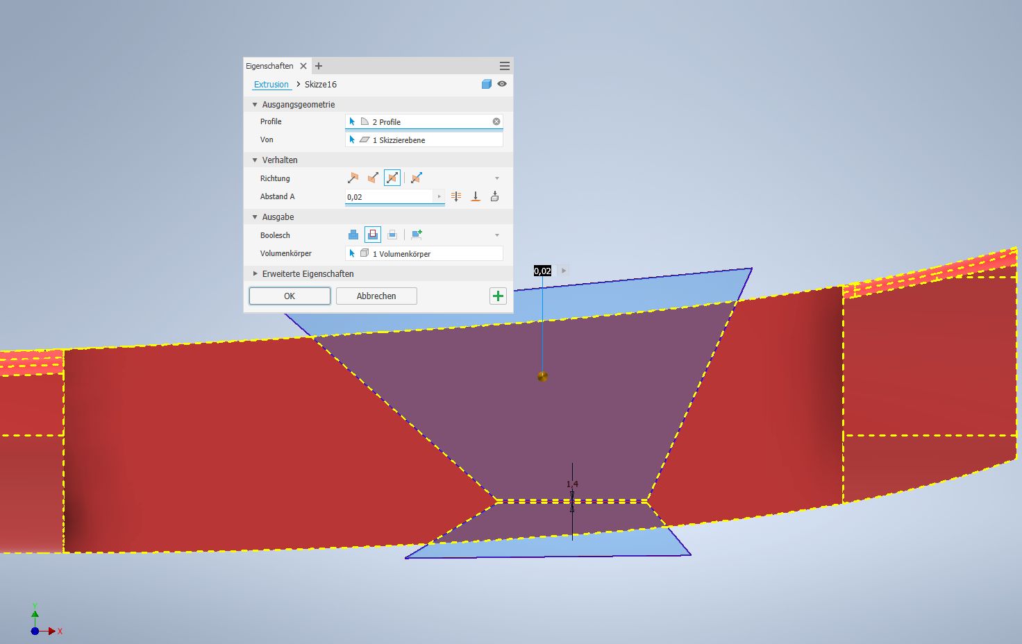 Ich halbiere mein Solid also vertikal und lege die Skizze an. Da wird dann das Material entfernt. Dabei gehe ich in beide Richtungen! Also auch in das derzeit nicht vorhandene Material.