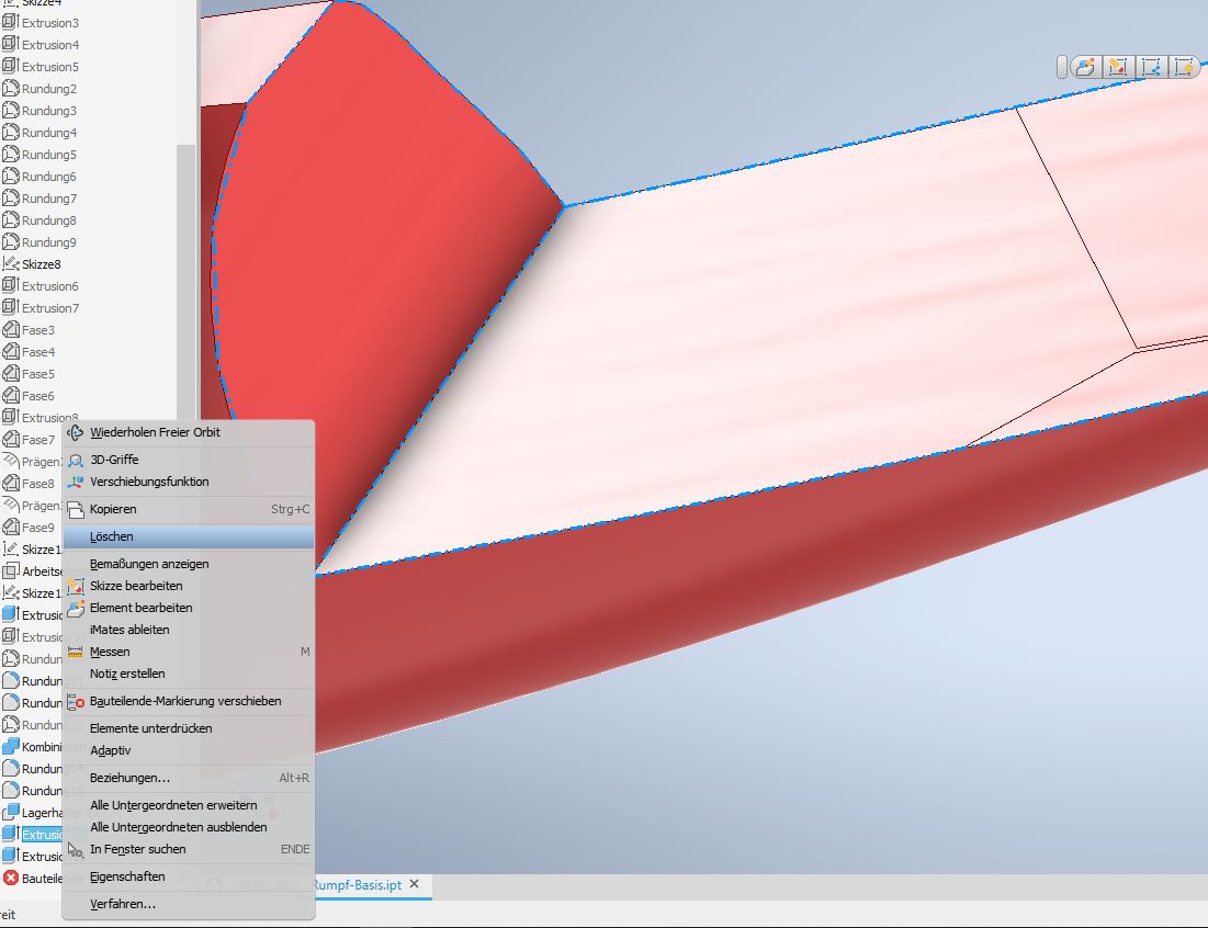 Sobald das erledigt ist, lösche ich die erst Extrusion, die meinen Rumpf halbiert hat. Da fragt er mich, ob ich alle Elemente löschen möchte. Natürlich nicht! Ich will ja die zweite Extrusion der Focksteife behalten...also bitte bisschen aufpassen.