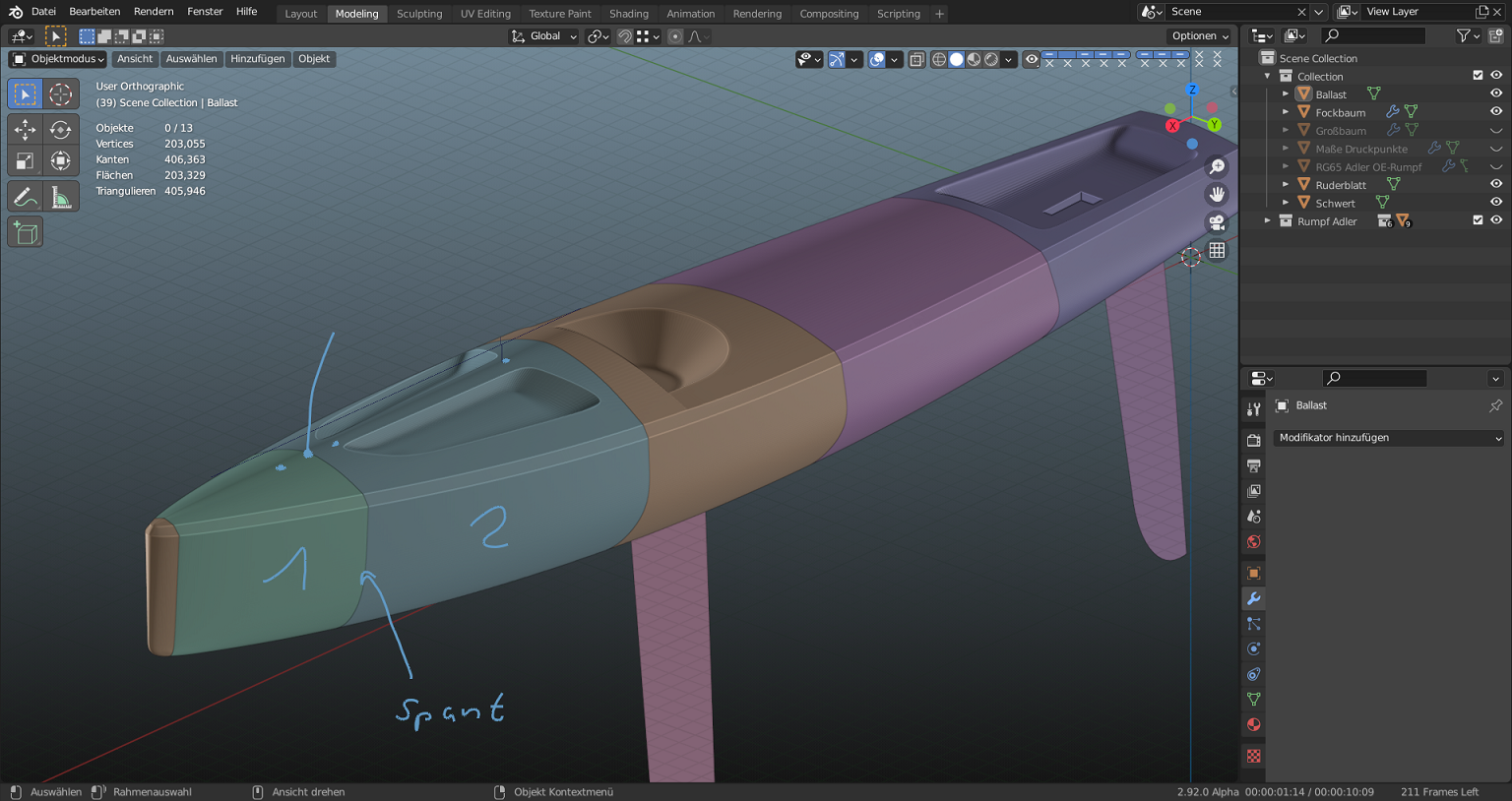 Ich muß (bedingt durch die begrenzte Druckhöhe meines Druckers) den Rumpf in Segmente unterteilen.