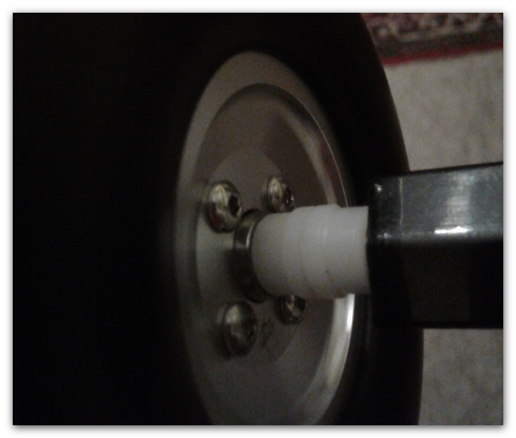 Heute habe ich die neuen Räder montiert, ging ganz easy :tup: . Die Gleitlagerbuchsen kann man aus der Felge ganz einfach rausnehmen und die orig. Kugellager aus de Bat1 einsetzen. Sie stehen zwar aus der Felge etwas hervor aber das macht nichts, das Rad dreht sich wunderbar. Da die neuen Räder von der Nabenbreite ein Stück schmaler sind habe ich die Laufbuchsen innen auf die Achse gesteckt als Ausgleich.