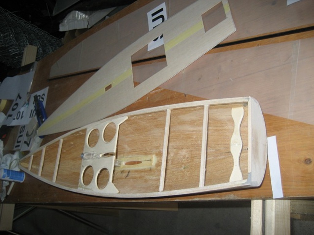 Die verkleinerte ich auf 63 % und streckte den Rumpf wieder auf 65 cm (nur größerer Spantabstand).