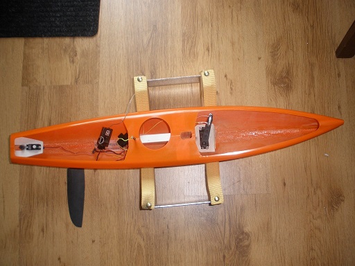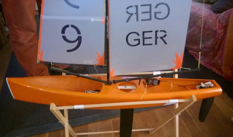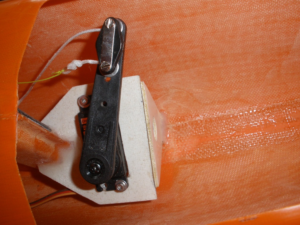 Holger hatte sich entschieden eine Segelwinde (GWS, ca 50g) einzubauen. Ich bin sehr gespannt wie sie sich bewährt und ob sie nicht evtl. zu weit vorne ist.