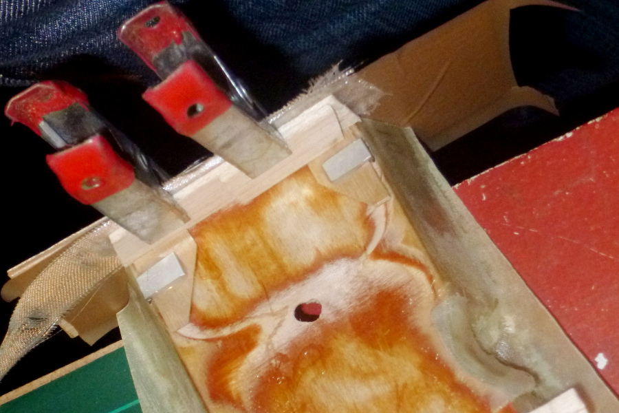 Für das Segelservo habe ich Sperrholzplättchen mit in den Rumpf laminiert, unter denen Kabelbinder entlanggeführt werden kann, ich hoffe, man kann es erkennen: