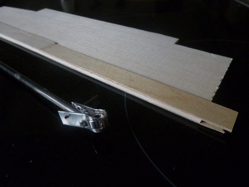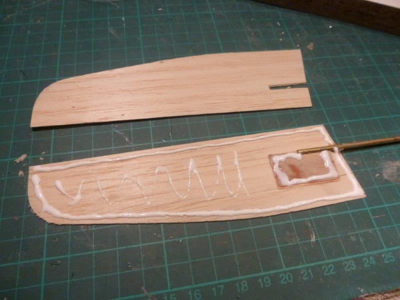 Das Ruder ist aus Balsa + GFK. Zur Kraftübertragung zwischen Ruderachse und Ruderblatt habe ich ein Stückchen Flugzeugsperrholz in das geschlitzte Messingröhrchen gepackt: