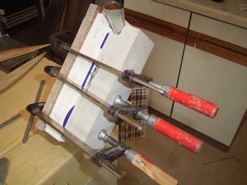 Die Form wurde mit ein paar Blechen von aussen gehalten/stabilisiert und vorsichtig mit Schraubzwingen gegen ein aufgehen gesichert!(durch zu starkes zudrehen der Zwingen konnte man die Form verdrücken