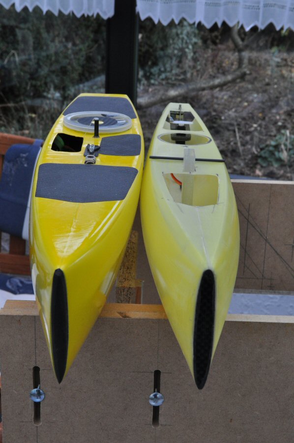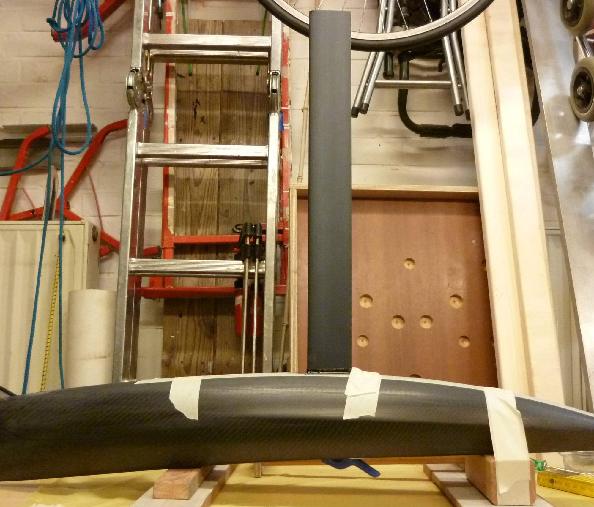 Das Boot liegt auf dem Kopf, Bug und Heck genau in Waage, Kieltasche genau senkrecht fixiert. Die Tasche ist oben geschlossen und wird einfach mit verdicktem Harz unter Deck verklebt. Gleichzeitig lasse ich von oben schon mal mit Kohlestaub gefärbtes Harz in den Spalt einlaufen.