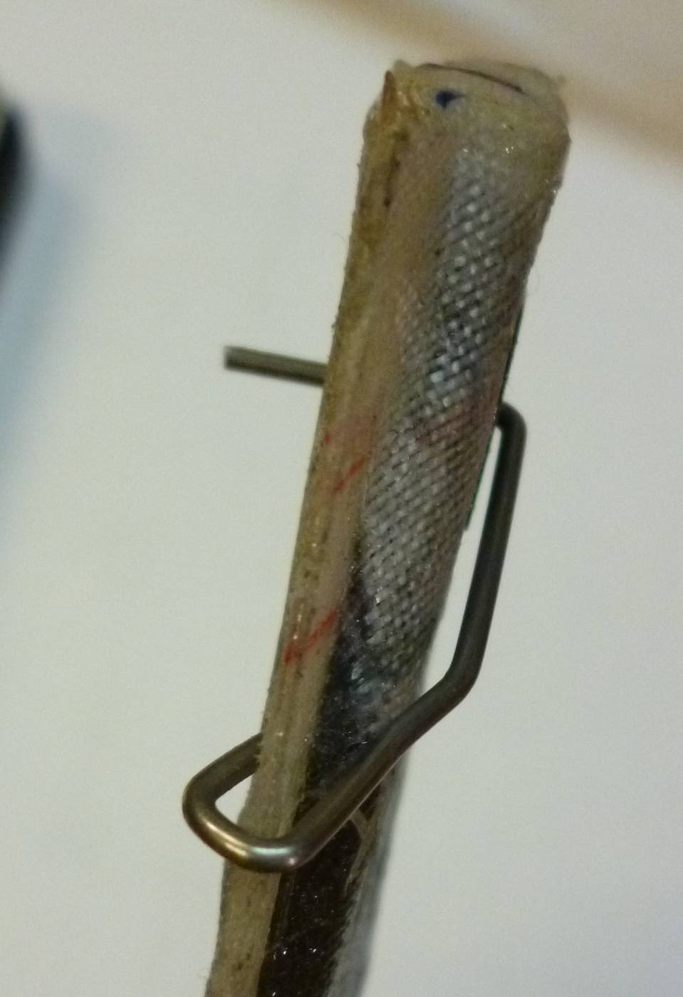 Ein Federstahlstift 1,3mm, so gebogen, dass er unter Spannung hinter die Tasche geklemmt wird.