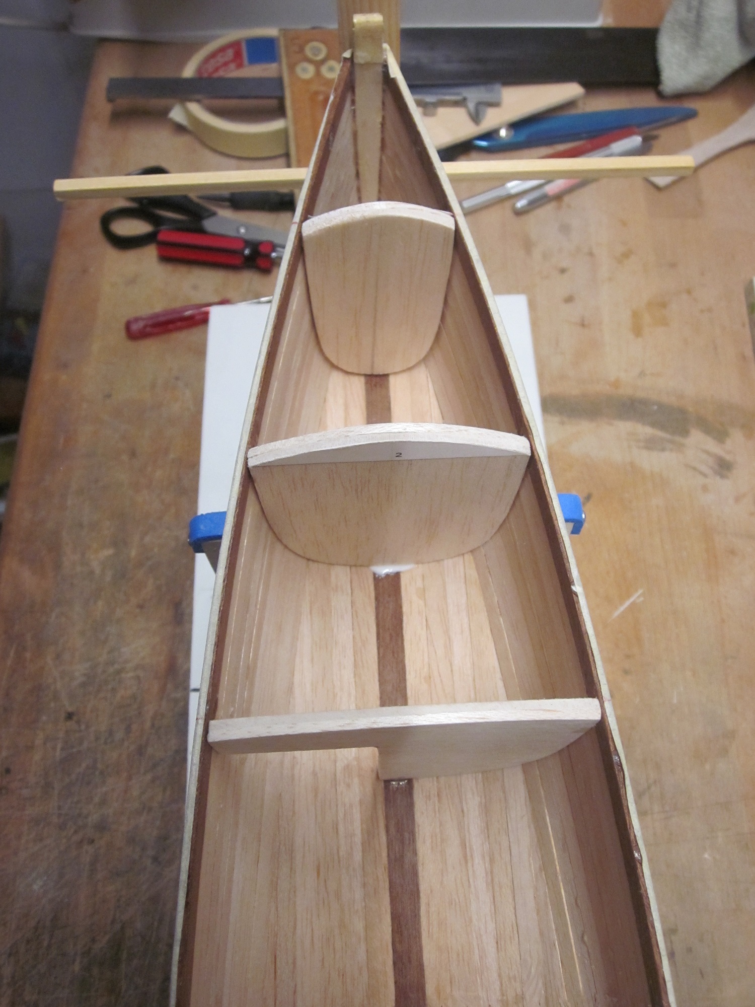 Als nächster Schritt musste die Deckblatte auf die Schale montiert werden, dazu habe ich das Holz ganz an der Bugspitze gut gewässert, damit ich die Rundung machen konnte, ohne dass die Holzplatte riss.