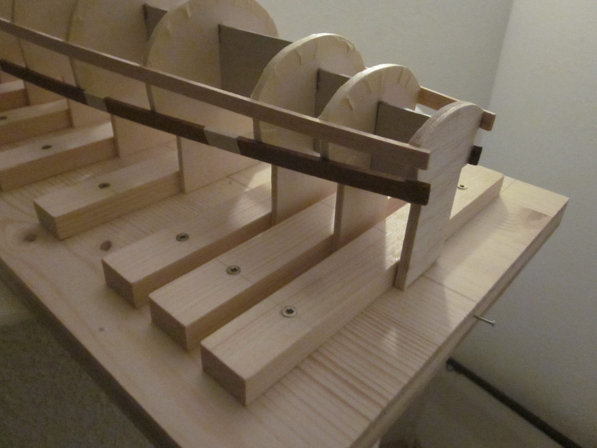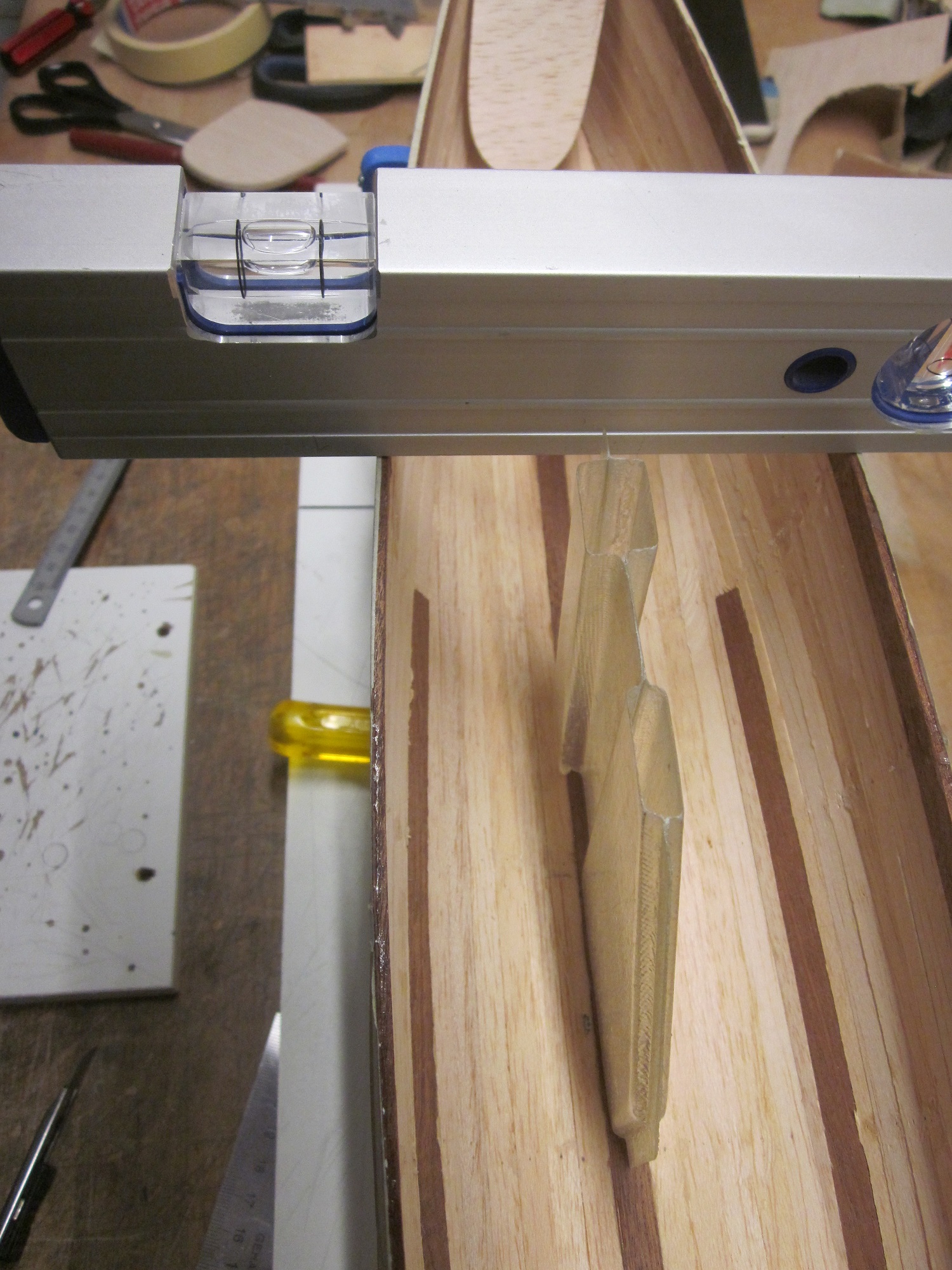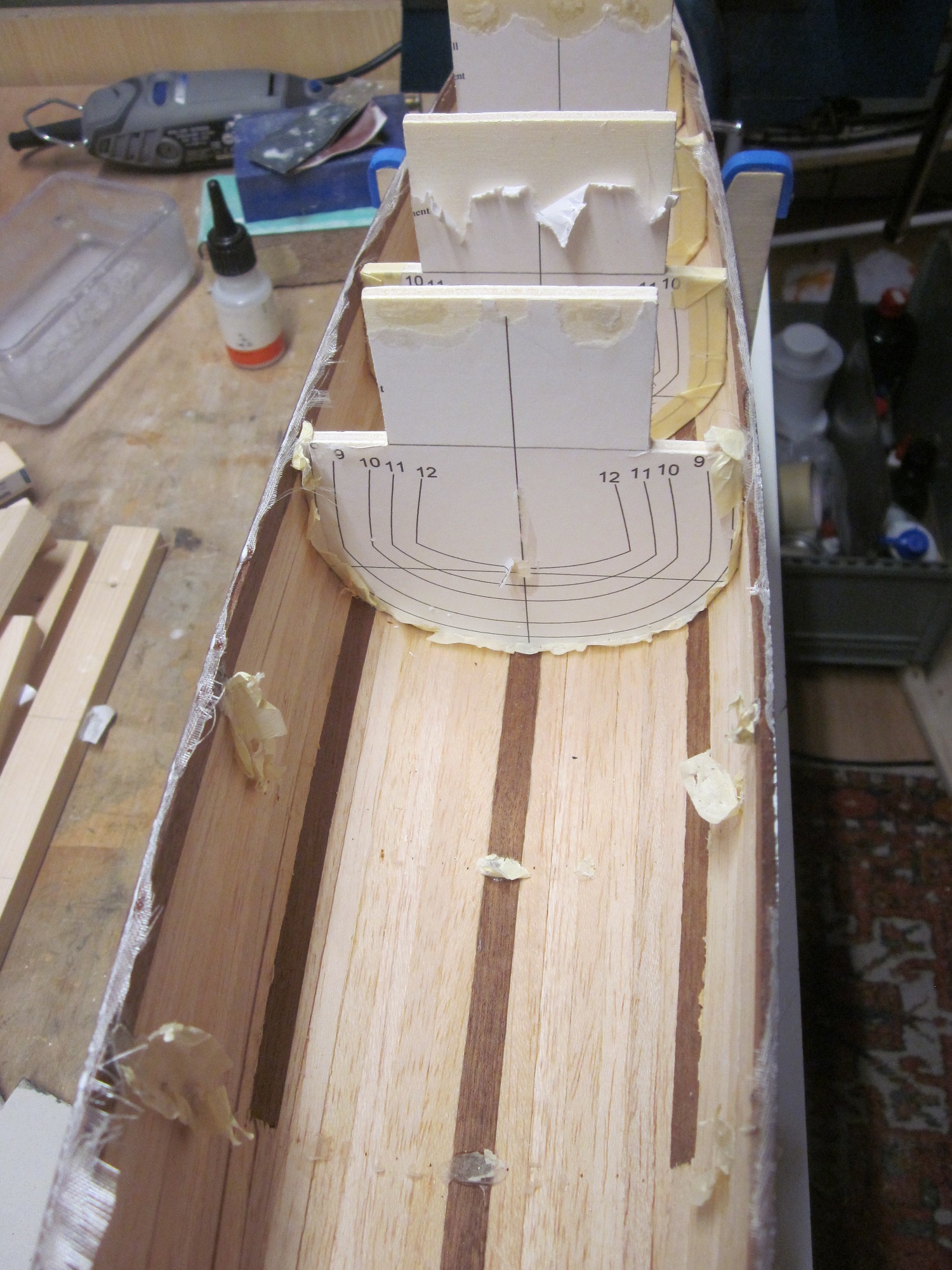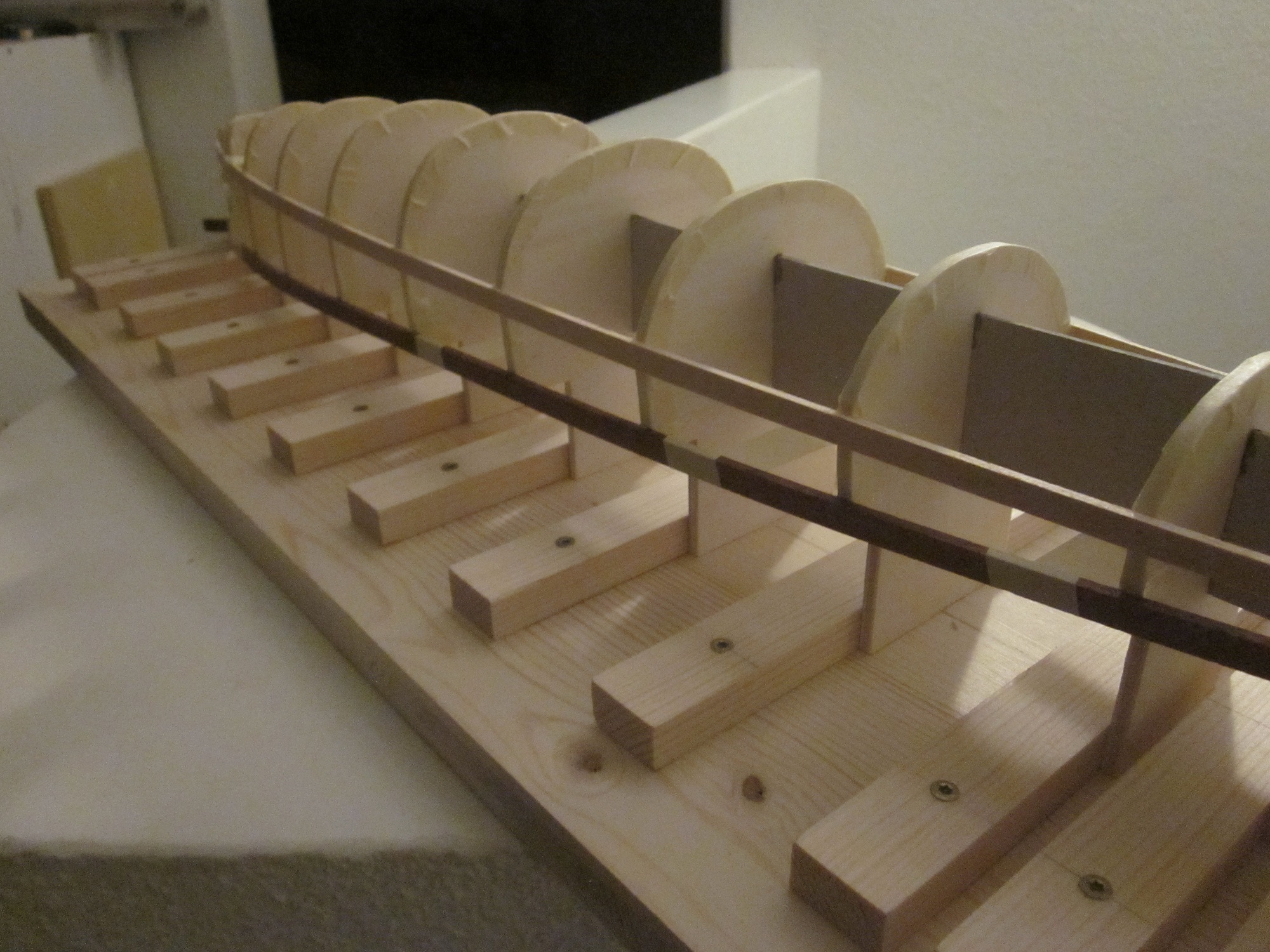 Nach einigen Hin und Her habe ich mich entschlossen das Deck aus einem Stück zu bauen und zwar mit Flugzeugsperrholz 1mm dick. Die ganze Angelegenheit war noch etwas anspruchsvoll, hat doch das Deck im vorderen Drittel einen leichten Anstieg bis zum Bug.