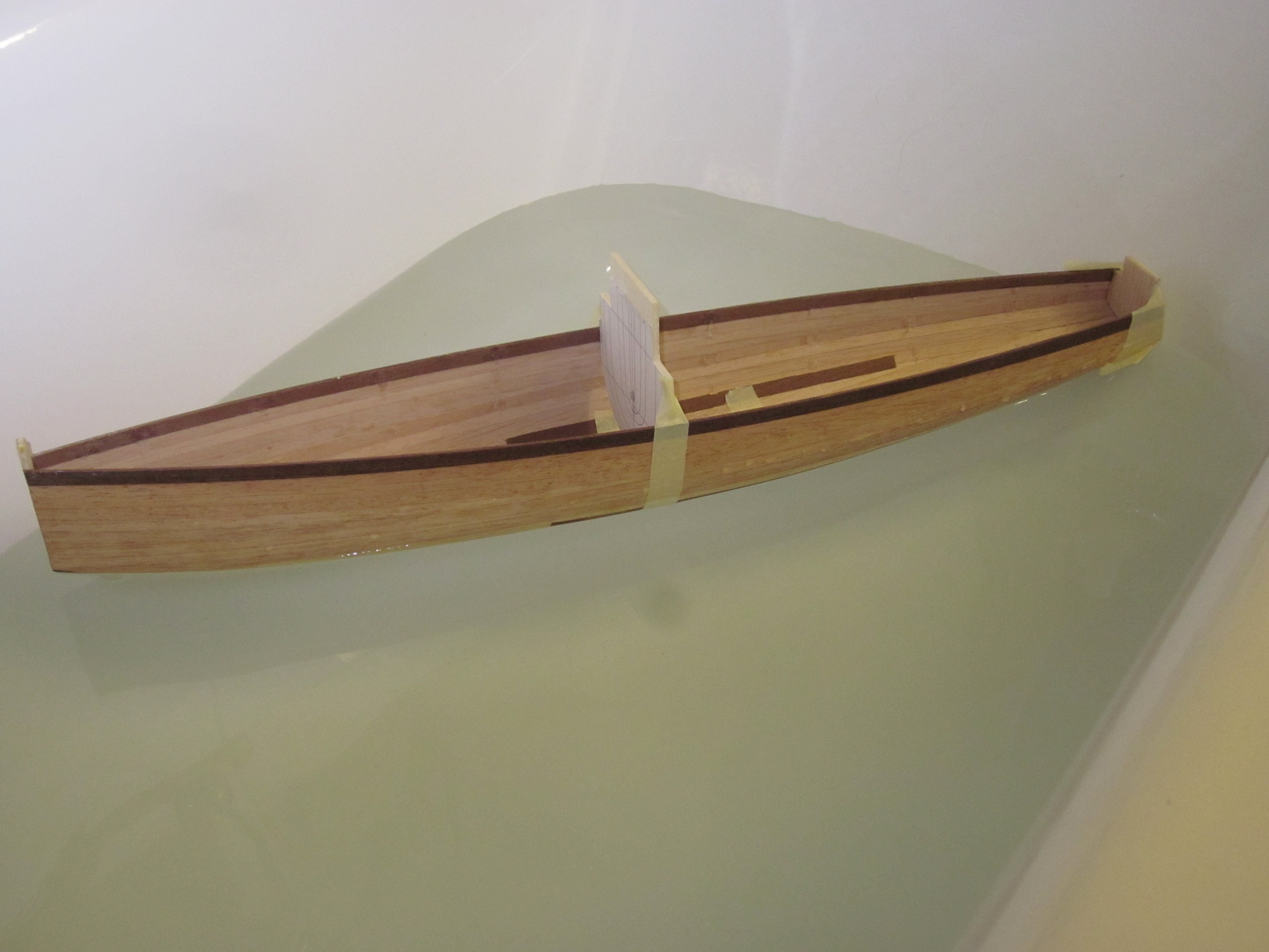 Als nächster Schritt musste die Deckblatte auf die Schale montiert werden, dazu habe ich das Holz ganz an der Bugspitze gut gewässert, damit ich die Rundung machen konnte, ohne dass die Holzplatte riss.