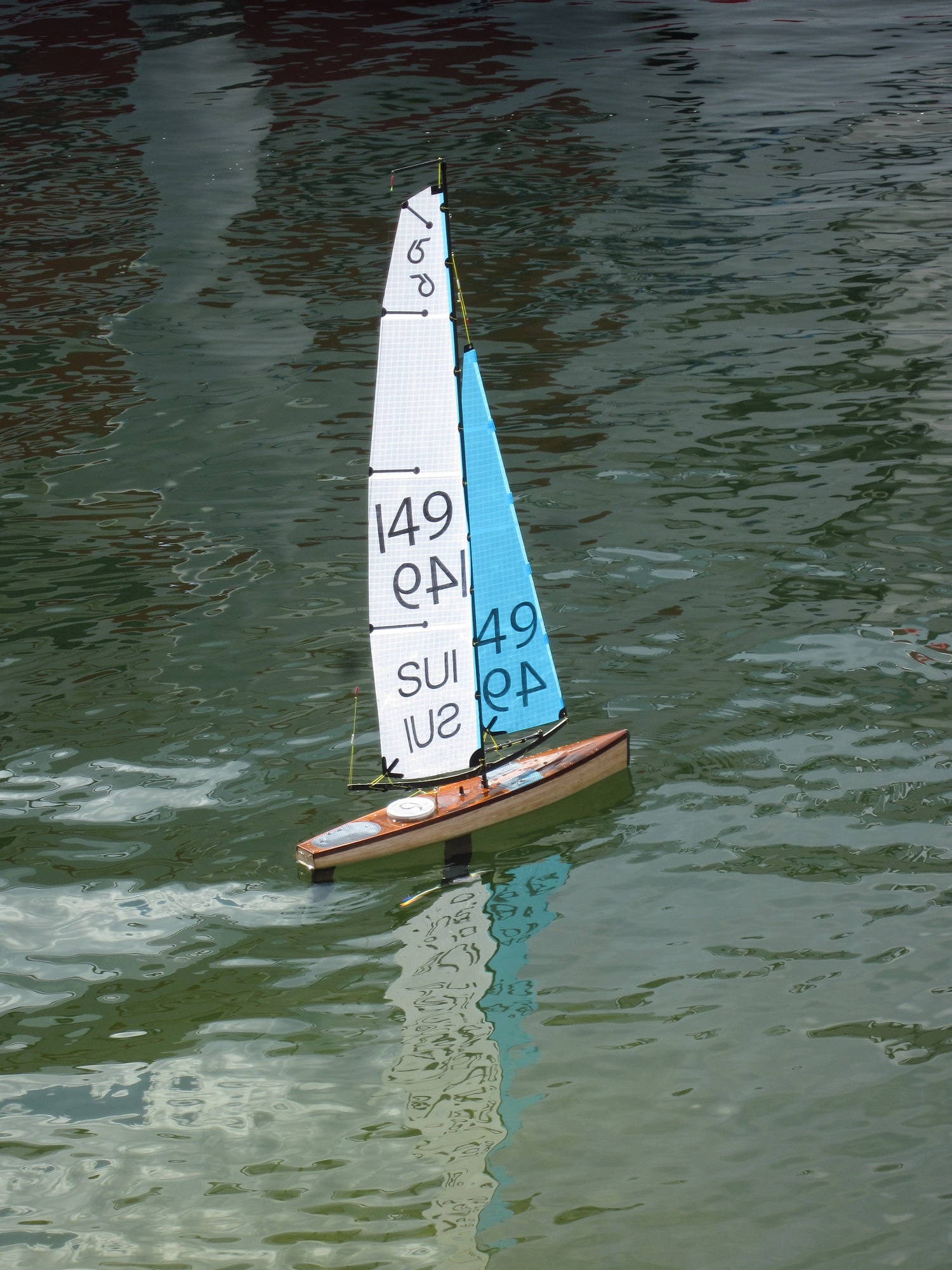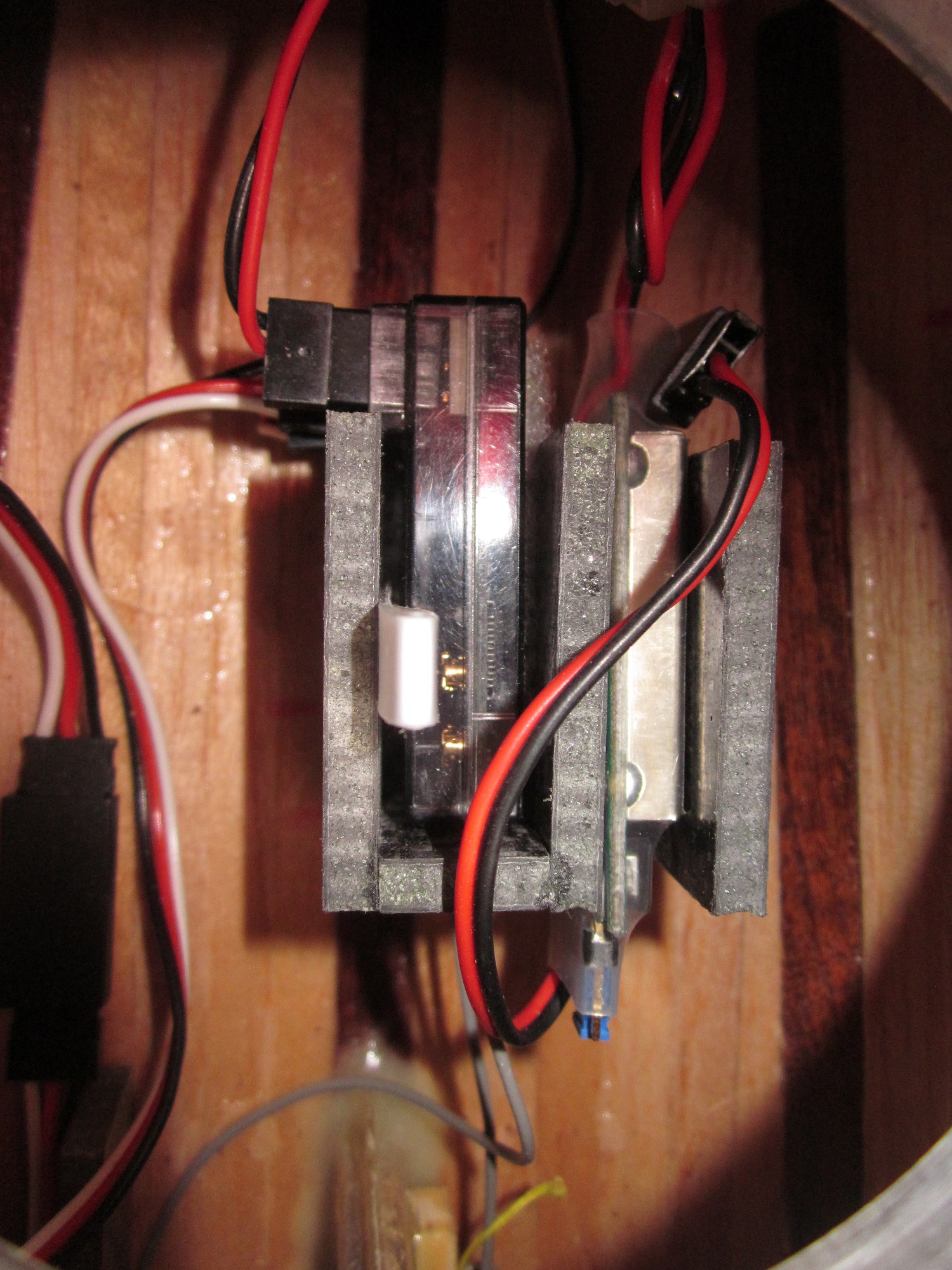 Die nächsten Schritte waren der Einbau der Servo-Halterungen und der Halterung für den Empfänger und den Bec. Die Halterungen habe ich aus selbst laminiertem Sandwichmaterial hergestellt und sie sind sehr einfach gehalten. Der Segelverstell-Servo wurde liegend eingebaut und der Servo wird einfach mit einem Sperrholzplättchen eingeklemmt. Empfänger und Bec werden zwischen die Seitenwände geklemmt und an der Stirnwand Seite Bug habe ich 2 Löcher gebohrt für die Antennen.