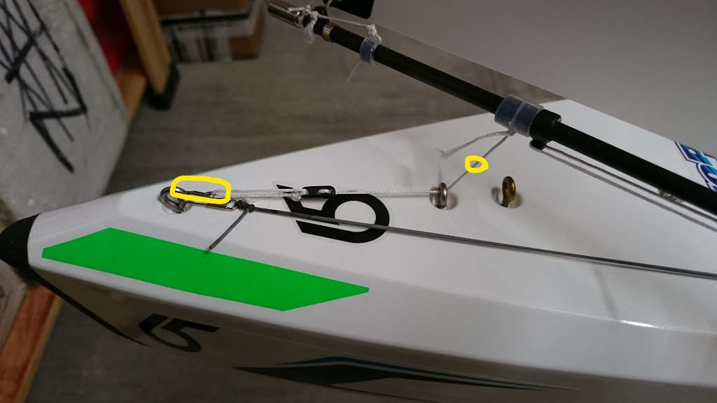 Hallo Marc, ich kenne "nur" die DF 65, hier ist ein Segelwechsel ja von vornherein geplant. Daher sollten alle Segelpunkte lösbar sein, daß Mast, Bäume und Schoten am Schiff bleiben. Wichtig ist dabei, dass alle Punkte, wo Knoten die Seile halten, nicht geknotet werden, sondern, dass dort Haken zum Einsatz kommen: Aufhängung der Fock am Mast, Befestigung der Fock vorne am Fockbaum ( bei der DF kann man das Kontergewicht herausziehen und damit die Fock lösen ), die Fock am Ende des Baumes wird von einem Haken gehalten, die Dirk bekommt entweder oben oder unten einen Haken = lösen können. Beim Groß habe ich den Segelkopf über eine kleine Talje an der Fockaufhängung befestigt, damit gibt es Platz für einen Haken. Unten muß der Haken an das Cunningham geknotet werden, das Schothorn wird bereits durch einen Haken gehalten. Also kannst Du damit das Segel abnehmen und tauschen.