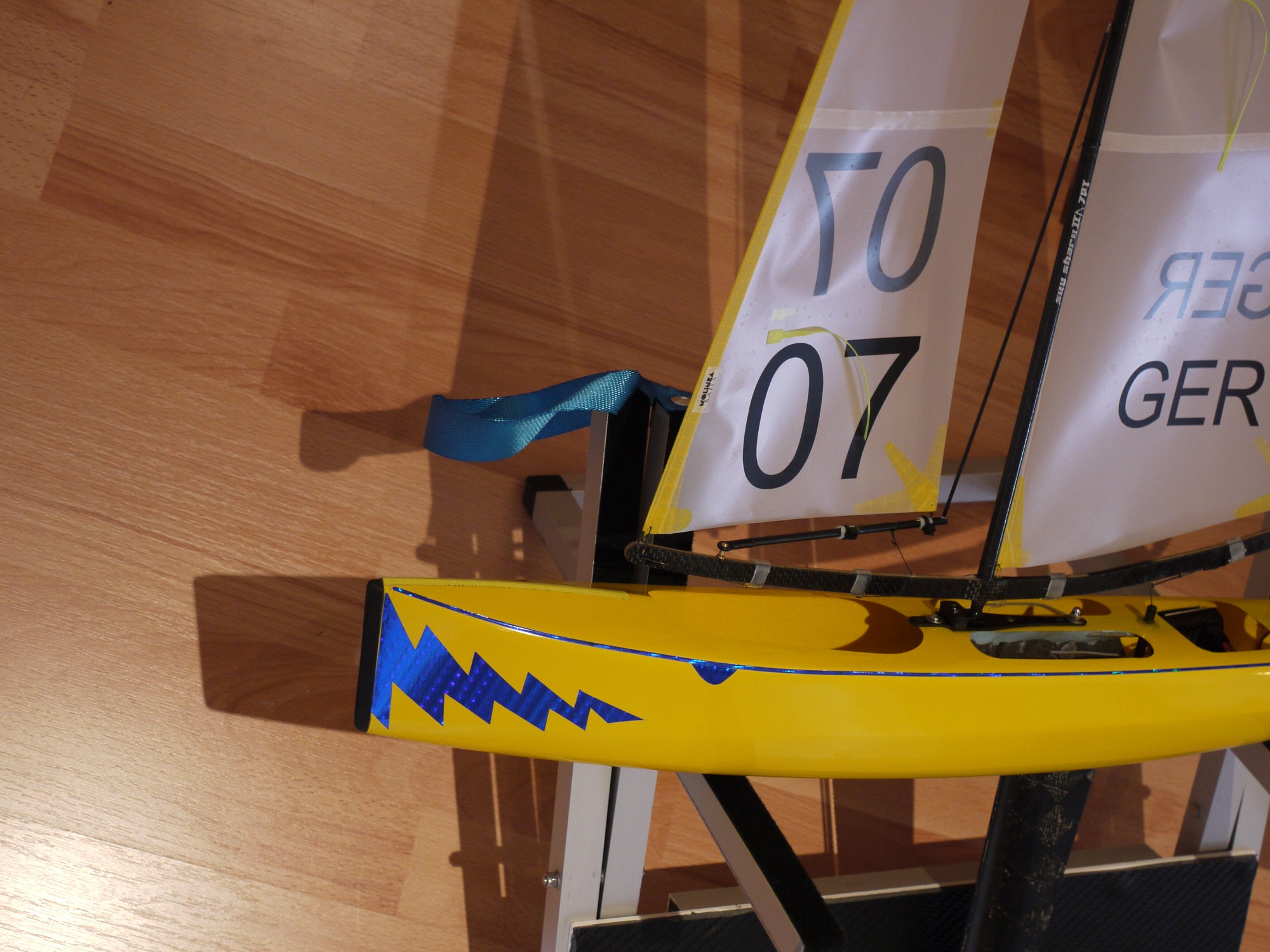 Eine gedruckte Masttasche von mir hat er verbaut, die Kieltasche ist Eigenbau. Gewichtsmäßig steht er ein paar Gramm besser da als meine gedruckten Boote. Ende März gibts die erste RG65 Regatta Japans, ich bin gespannt :mrgreen: