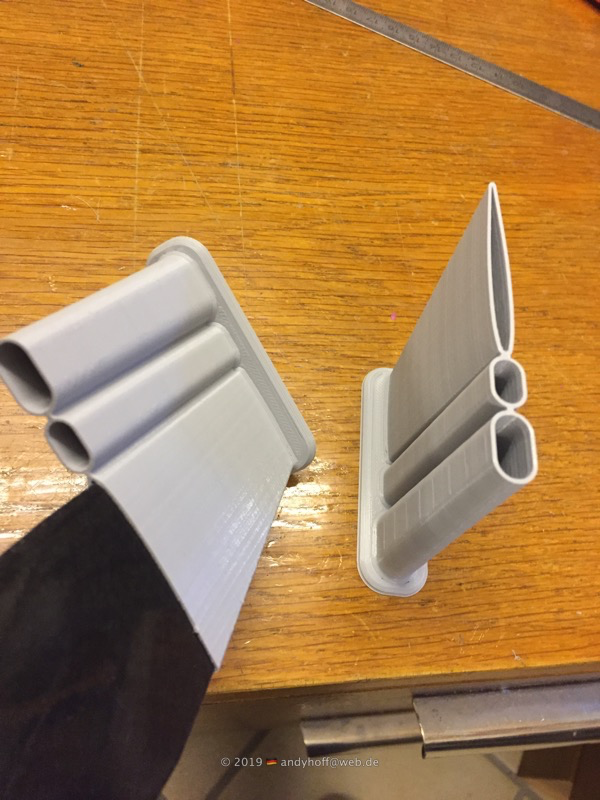 Konstruiert ist das ganze mit 0,8mm Wandstärke .. also mit 2 Perimentern (bei 0,4er Düse) zu drucken. Alle 3 Taschen sind mit einem 1,2mm breitem Mittelsteg verbunden. So ergibt sich eine stabile Einheit die sich gut drucken lässt .. die Düse muss nicht absetzen.