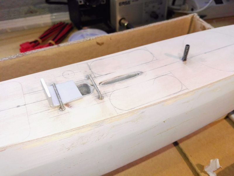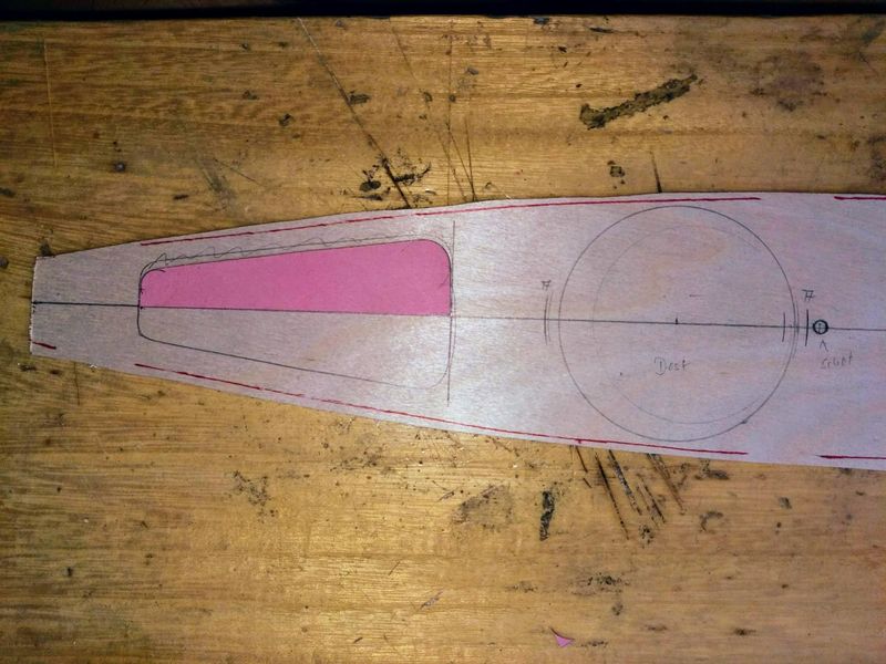 Ich entschied mich, hier nicht den Plänen zu folgen. So sah ich links und rechts der Mast-/Kieltasche kleinere Öffnungen vor: Rechts für den Einbau des Empfängers, links wegen der Schot und der Optik. Ebenfalls dort für den Einbau eines wasserdichten Schalttasters für die Elektrik. Hinter dem Schotröhrchen für Dose und Ruderanlage. Die Anzeichnungen erfolgten mit Halbschablonen und Zirkel unter dem Deck. Zur Orientierung dienten die Mittellinie und der Deckumriss.