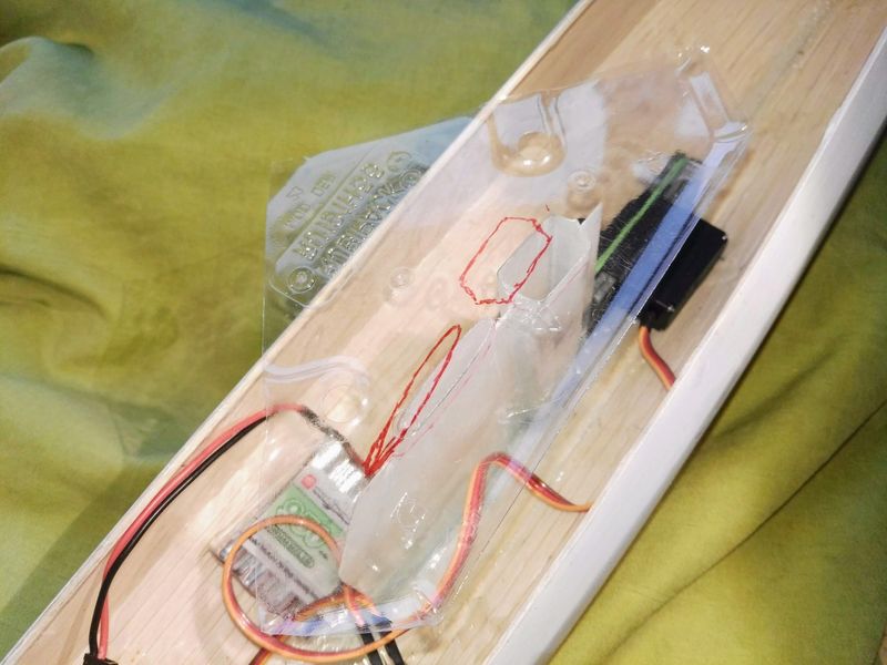 Ich entschied mich, hier nicht den Plänen zu folgen. So sah ich links und rechts der Mast-/Kieltasche kleinere Öffnungen vor: Rechts für den Einbau des Empfängers, links wegen der Schot und der Optik. Ebenfalls dort für den Einbau eines wasserdichten Schalttasters für die Elektrik. Hinter dem Schotröhrchen für Dose und Ruderanlage. Die Anzeichnungen erfolgten mit Halbschablonen und Zirkel unter dem Deck. Zur Orientierung dienten die Mittellinie und der Deckumriss.