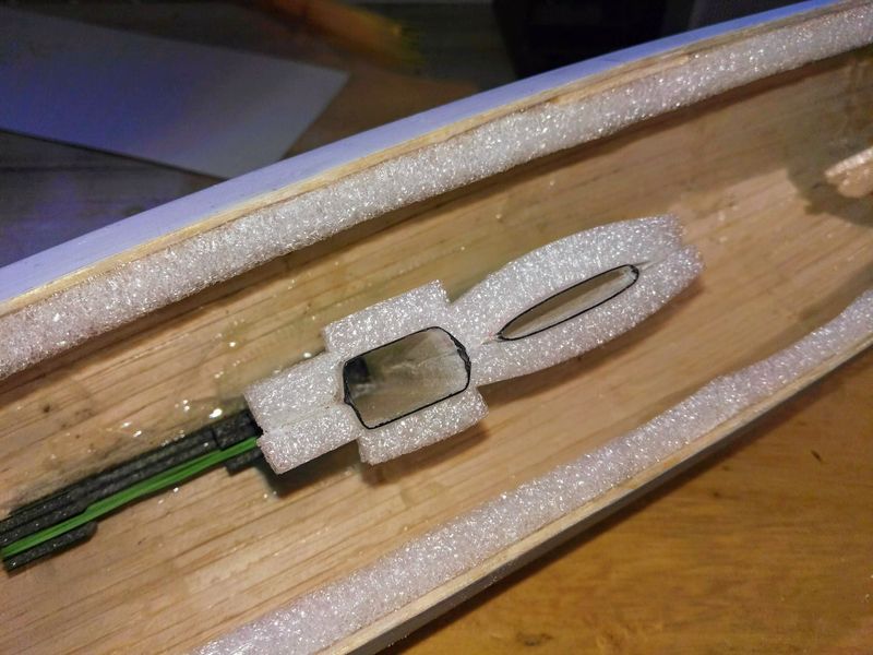 Das Röhrchen stützte ich unter Deck mit drei kleinen Dreiecken aus CFK-Sandwich ab.