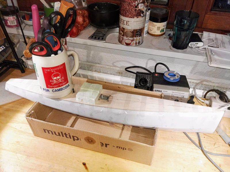 Danach kommen noch Nacharbeiten wie spachteln und Rumpföffnungen ausschneiden, versäubern von deren Kanten und Einkleben der Dose. Zuletzt wird auch außen noch alles mit Parkettlack versiegelt.