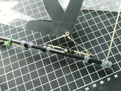 Auch den Anschlag der Groß am Mast habe ich geändert. Nun mit Takelschnur. Die Mastringe von der DF V6 waren zu eng.