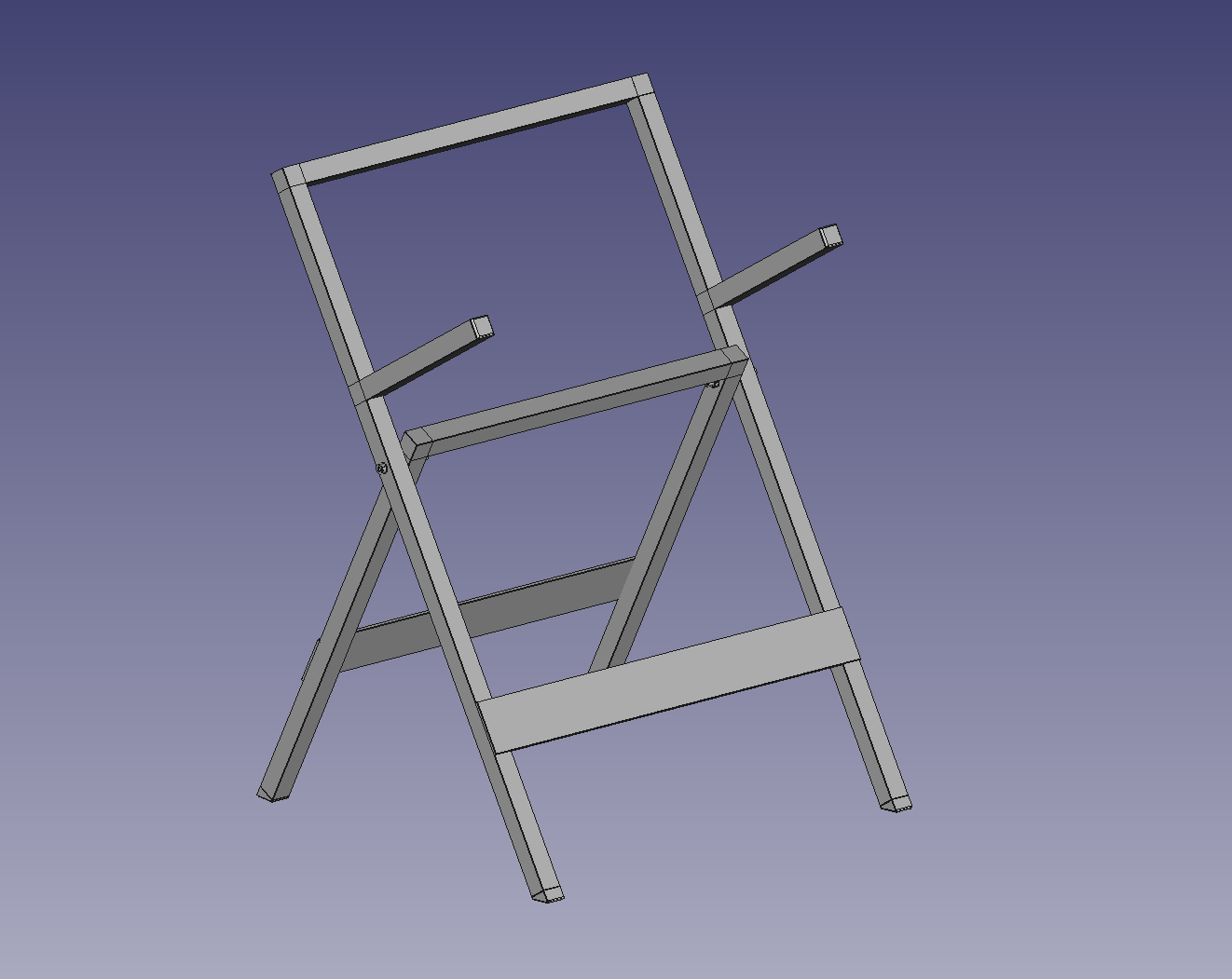 Die Rohre sind schnell gezeichnet, kniffliger waren die Eck- und T-Verbinder, die Endkappen und die Füße, die ich alle drucken wollte. PartDesign und Sketcher ware mir anfänglich Bücher mit sieben Siegeln, gaben aber nach und nach ihre Geheimnissen preis. Langsam bekam ich die Grundzüge von FreeCAD in den Griff und die ersten Teile purzelten aus dem Drucker. Ich habe es erst in PETG versucht, ich habe es aber nicht geschafft, eine verlässliche Klemmung der Teile in den Vierkantrohren hinzubekommen. Entweder die Teile klemmten nicht richtig, oder es brachen Ecken raus. In TPU ging es viel besser und der Ständer nahm langsam Form an. Die Vierkantrohre wurden über die gedruckten Verbinder zu den Rahmenteilen montiert. Stabilität geben die Flachprofile, die aufgenietet sind. Lange (40mm) Schrauben bilden das Drehlager zwischen den beiden Rahmenteilen. Rohrisolierungen polstern die Auflagen ab, ein Gurtband verhindert die Grätsche.