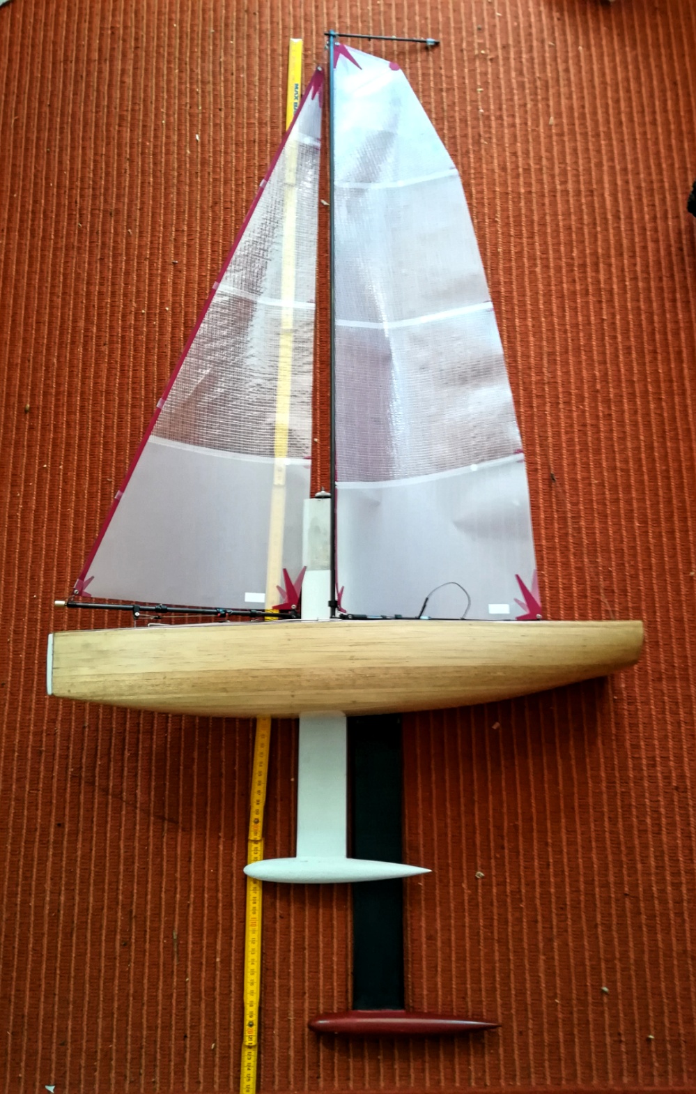 Das erreichte Rumpfgewicht sollte wohl passen, ist das Boot doch auf eine Verdrängung von 1200gr. konstruiert und trägt mehr Segelfläche als unsere RG.