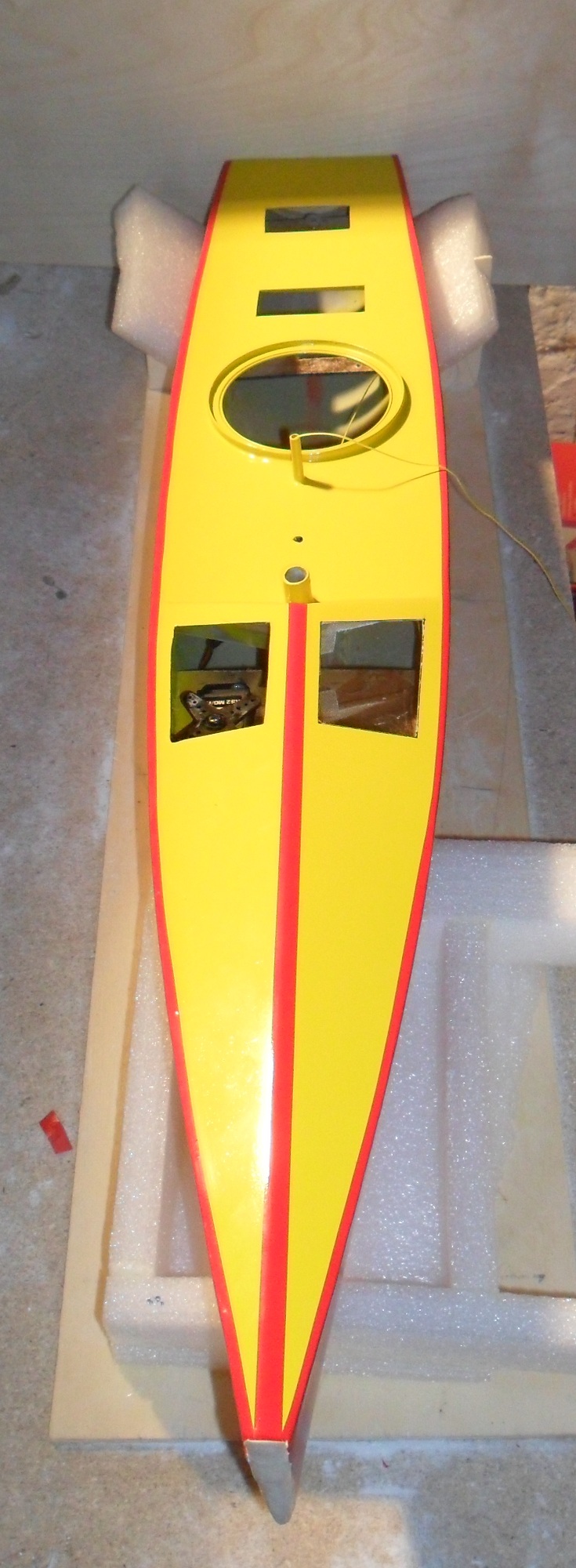 Ich weiß das der Deckel viel zu groß ist, aber ich habe es vorher schon mal mit einem kleiner probiert,da bin ich nicht so ins Boot reingekommen,vielleicht ändere ich den auch noch.Beim Aufkleben vom vorderen Deck habe ich das Boot schon umgedreht gehabt,Deck nach unten,hier ist es schon trocken und zugeschliffen.