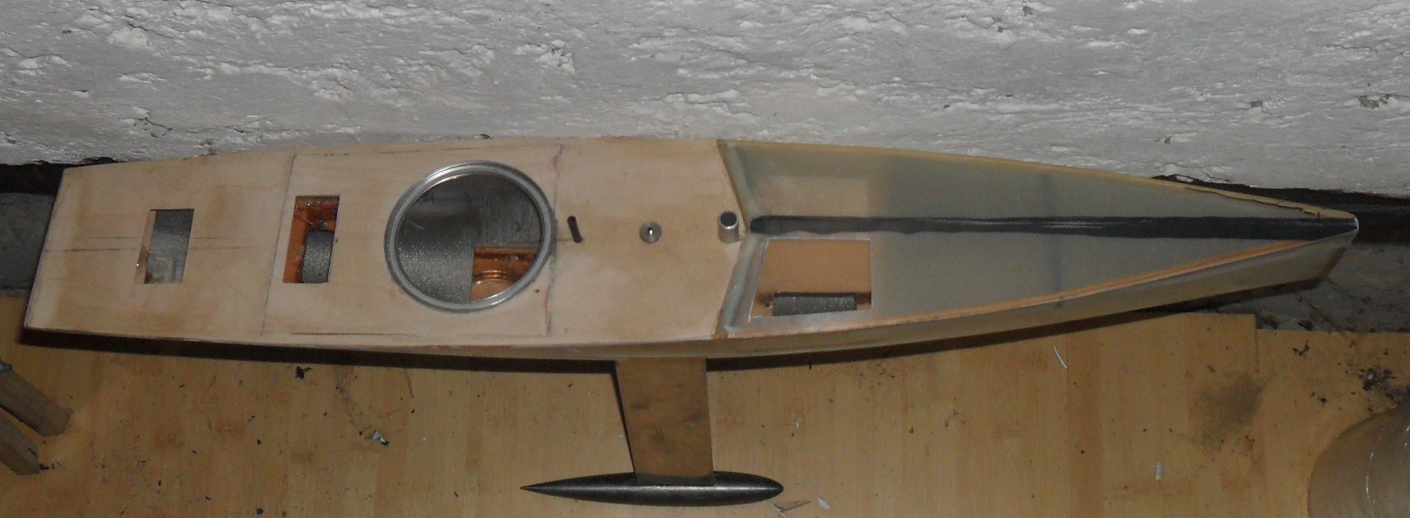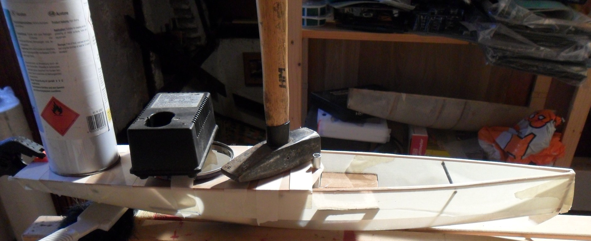 Ich weiß das der Deckel viel zu groß ist, aber ich habe es vorher schon mal mit einem kleiner probiert,da bin ich nicht so ins Boot reingekommen,vielleicht ändere ich den auch noch.Beim Aufkleben vom vorderen Deck habe ich das Boot schon umgedreht gehabt,Deck nach unten,hier ist es schon trocken und zugeschliffen.
