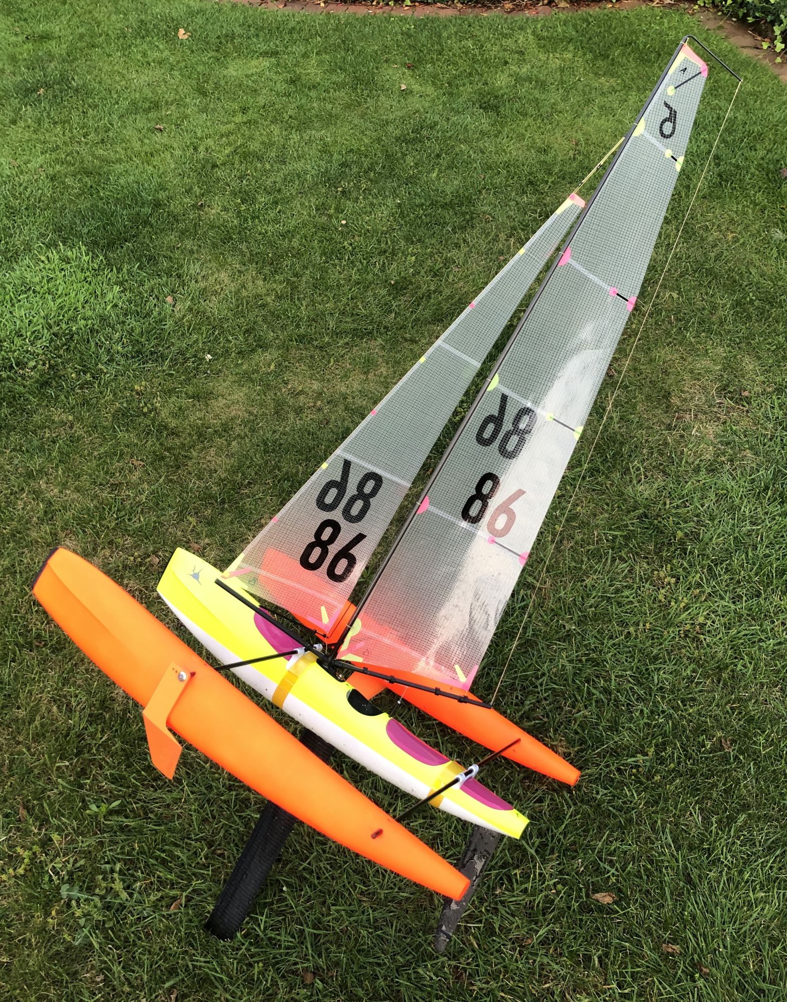 Das ganze bringt dann segelfertig um die 500g auf die Waage, je nachdem welche Kombination von Centerboard und Foils montiert ist.