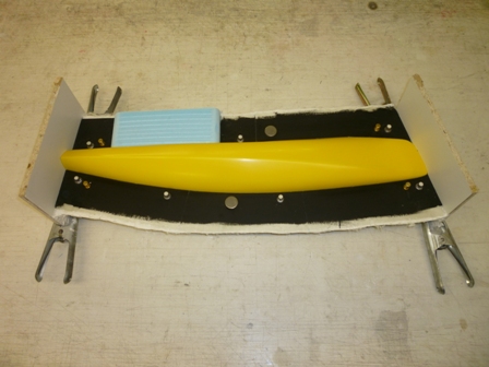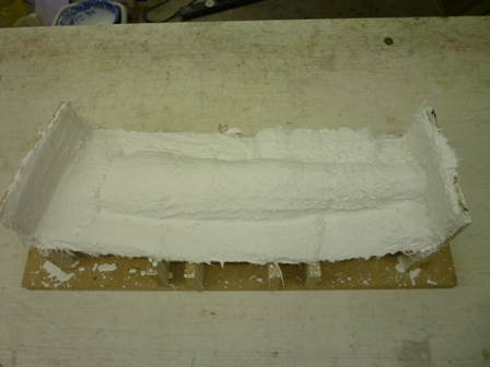 Spanten mit Füssen herstellen und auf einer Helling ausrichten. Wenn alles passt das Styro zwischen die Spanten kleben. Nach dem aushärten von der Helling nehmen und Spantfüsse abtrennen. Jetzt sollte man ein symmetrisches Sandwich haben das man weiter bearbeiten kann.