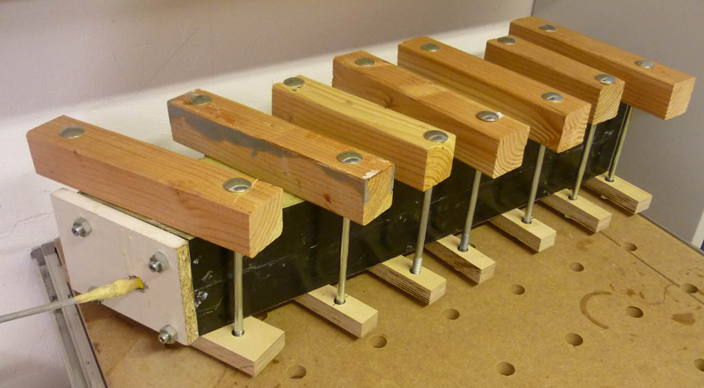 Das ist aussen 80er Glas, Innen 160 er Carbon, kein Entlüfter. Sicher ne ungünstige Kombi aber auch schlecht laminiert. Das 160er Carbon saugt wie Sau, das muss mann sehr Nass durchsaugen lassen, hat sich aber auch schlecht in die Enge Rundung gelegt. Dafür habe ich aber auch schon ne Idee....