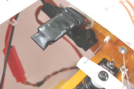 Bild 7 zeigt die 2,54 mm Buchsenleiste in welche der TRACO POWER Konverter gesteckt wird. Auf der Platine ist nur der Trimmwiderstand, der Reedkontakt sowie die Verkabelung zum Akku (roter BEC-Stecker), Empfängeranschlusskabel (blaue Servobuchse) und die vom LED-Saver vorhanden. An dieser Stelle wäre auch eine Variation der Ausgangsspannung mittels Steckbrücke und 2. Trimmwiderstand z.B. für eine höhere Ausgangsspannung zur Benutzung von 7,4 Volt Hochvoltservos (HV-Servos) bei entsprechender Eingangsspannung möglich. Die Eingangsspannung soll laut Datenblatt 2 Volt höher als die Ausgangsspannung sein. Hier ist die Verwendung von 3 zelligen LiPo´s mit einer höheren Spannungslage sinnvoll.