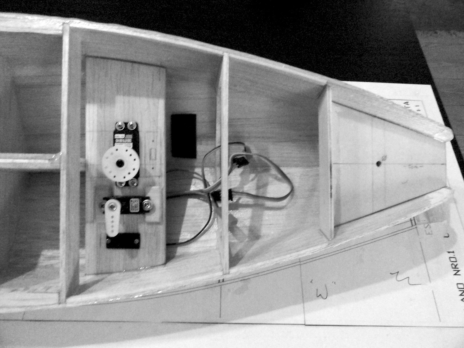 Das Segelservo sitzt bei Dir in der Mitte. Dann kannst Du keinen großen Servohebelarm anbringen, d.h. Du brauchst Umlenkblöcke. Der Platz ist aber durch den vorderen geschlossenen Spant etwas begrenzt, den würde ich noch herausnehmen oder zumindest etwas luftiger machen.