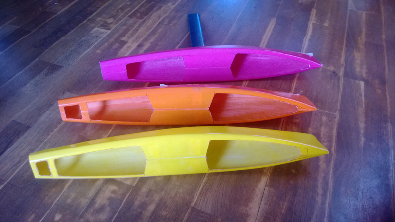 Aktueller Stand: Drei Rümpfe sind fertig, die Kiel-/Masttaschen eingeklebt, bei zwei Booten sind die Kielfinnen fertig geschliffen und am Rumpf angepasst.