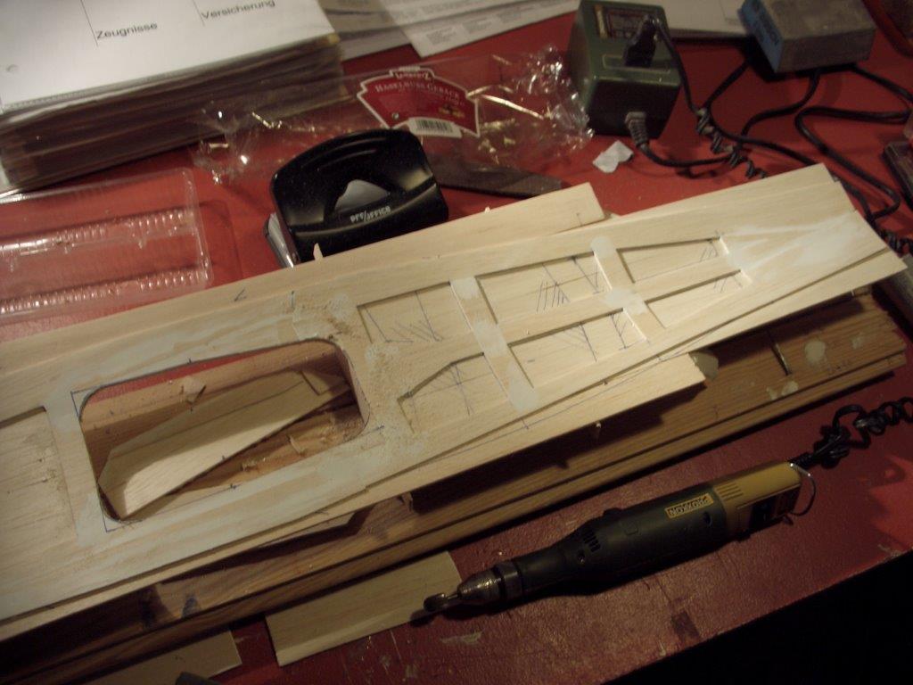 Irgendwann war trotzdem Land in Sicht ! Vorne Sicken zur Versteifung, dahinter der Rand für die Kajüte und am Heck das Cockpit.