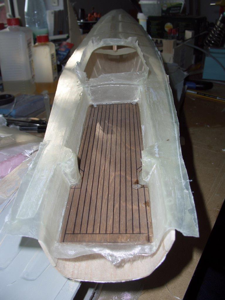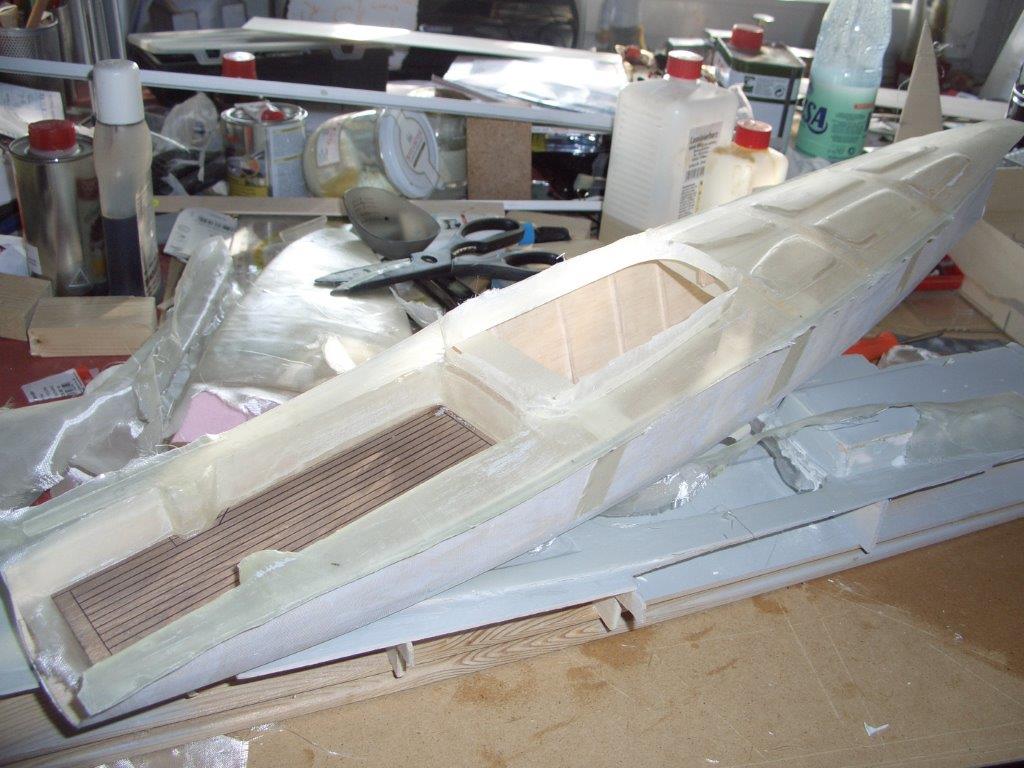 Form gewachst und laminiert (3x49gr). Als Teakdeck im Cockpit habe ich Flugzeugsperrholz eingelegt.