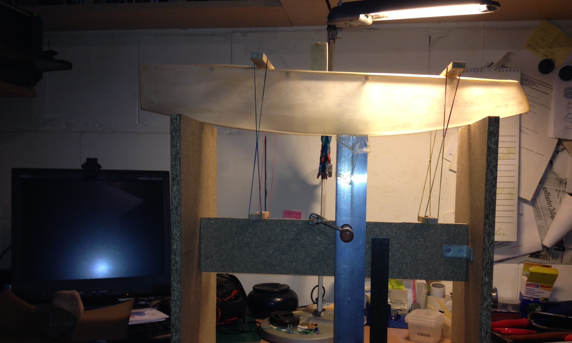 Das Bild zeigt den Einbau der Mast-Schwert- Tasche, auf der Hilfskonstruktion die ich mir nach Anregungen aus dem RG-65- Forum gebaut habe, danach hat alles bis jetzt ganze 120gr. auf die Waage gebracht, ich hoffe damit eine Maßeinheit zu haben halbwegs ordentlich gearbeitet zu haben